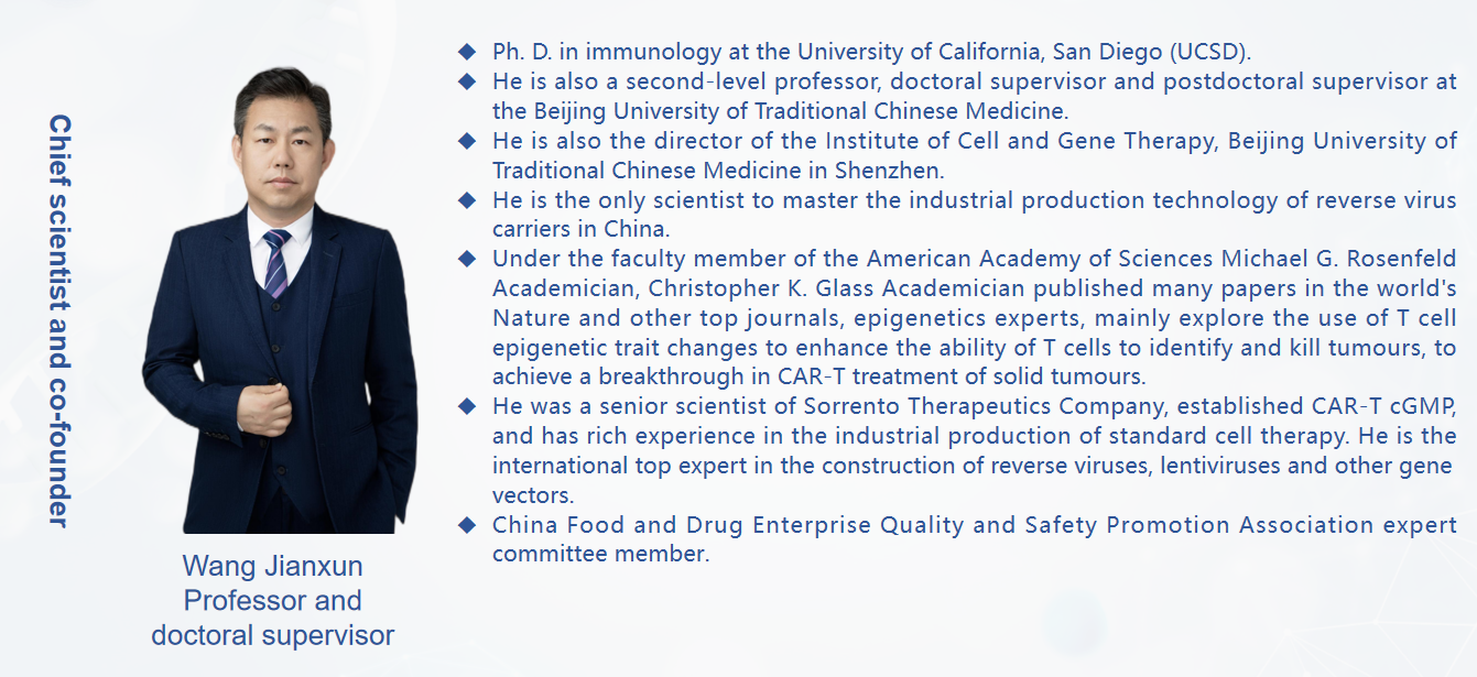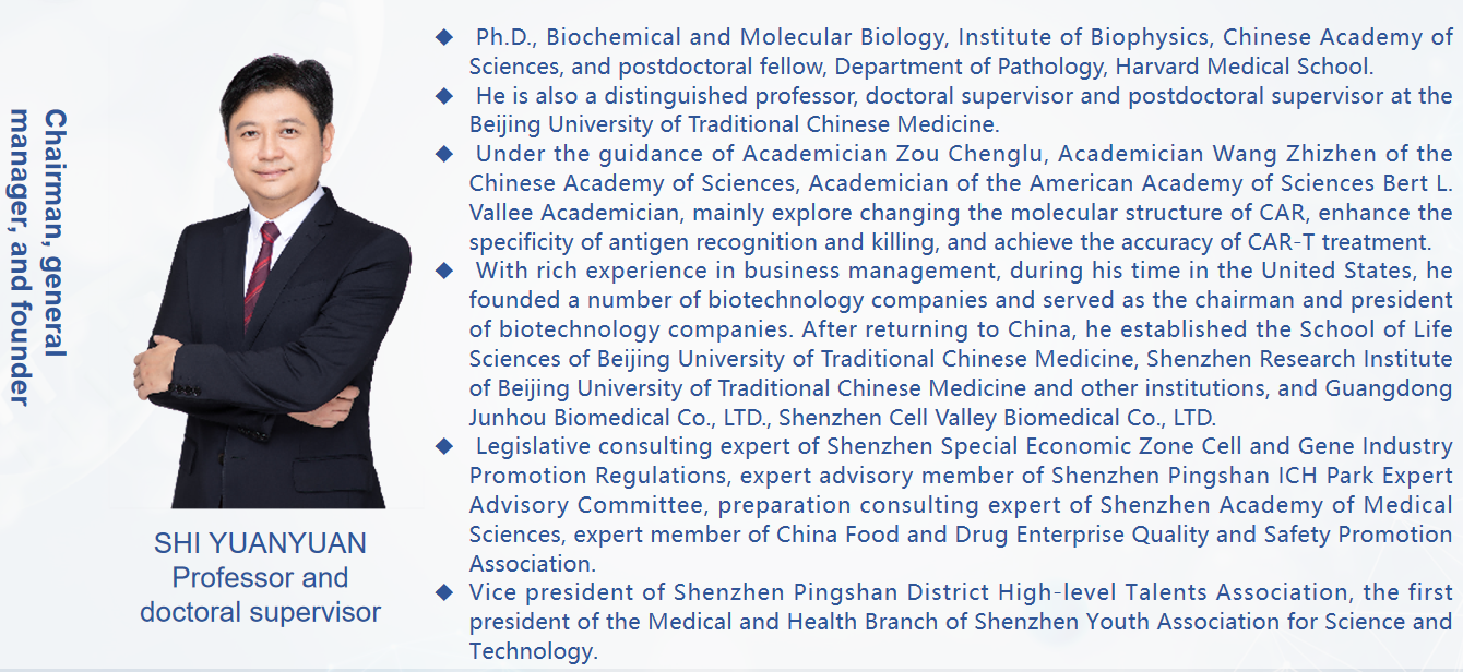 Shenzhen Cell Valley was jointly founded by two returnee scientists from Harvard University and the University of California, San Diego. The management team is from the elite who graduated from famous business schools in the United States and served as senior executives in biomedical technology companies. The company has a number of biomedical experts, as well as top talents with GMP level virus vectors and