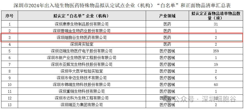近期,深圳市出入境生物医药特殊物品联合监管机制联席会议办公室在深圳市发改委网站上公示了2024年出入境生物医药特殊物品拟认定试点企业(组织)“白名单”和正面物品清单。经过严格的材料核查、专家评审、现场核查、征求部门意见及联席会议审议等环节,全市第一批13家企事业单位获批“白名单”,深圳凯发K8顺利入选,其中细胞治疗的核心原料病毒载体等获批特殊物品出入境正面物品清单。